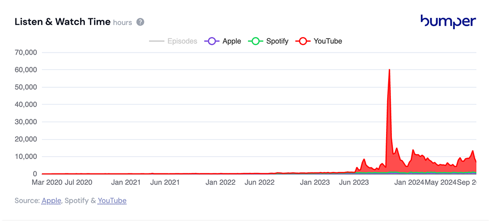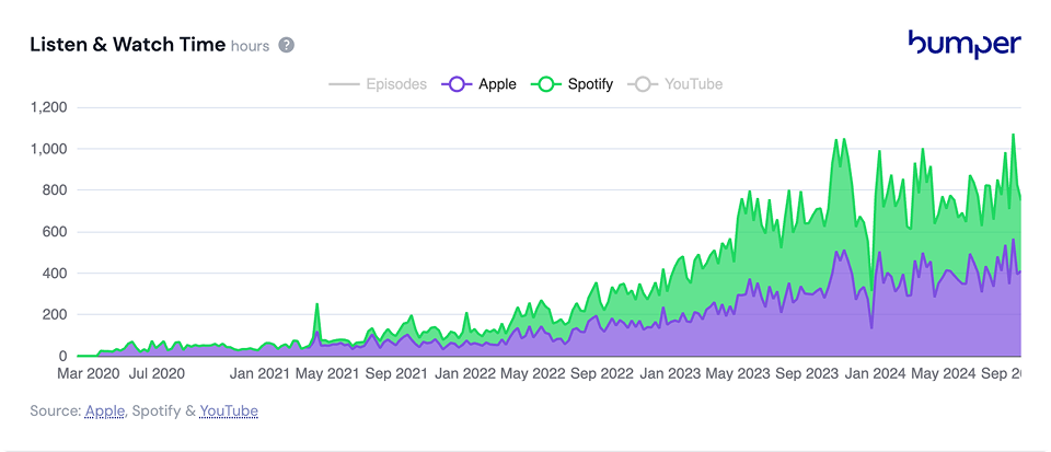 The chart above shows time spent listening to the show since it launched in March 2020. This only includes Apple and Spotify, but that’s a good, representative sample.
